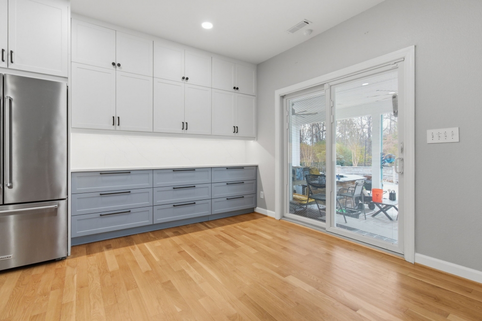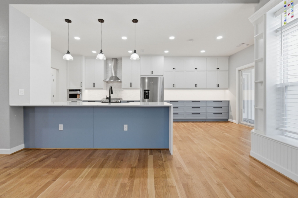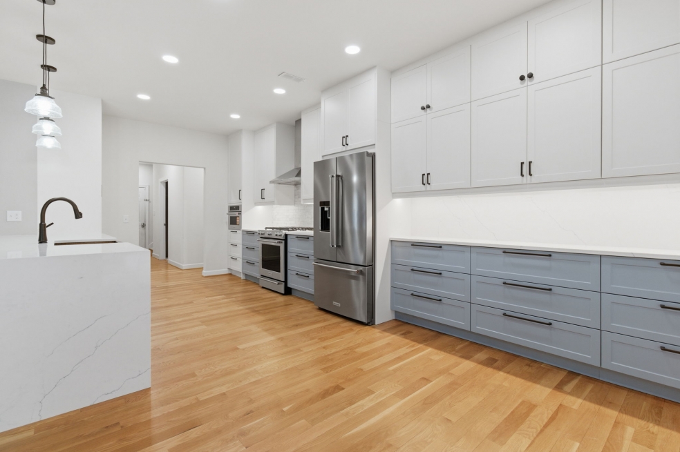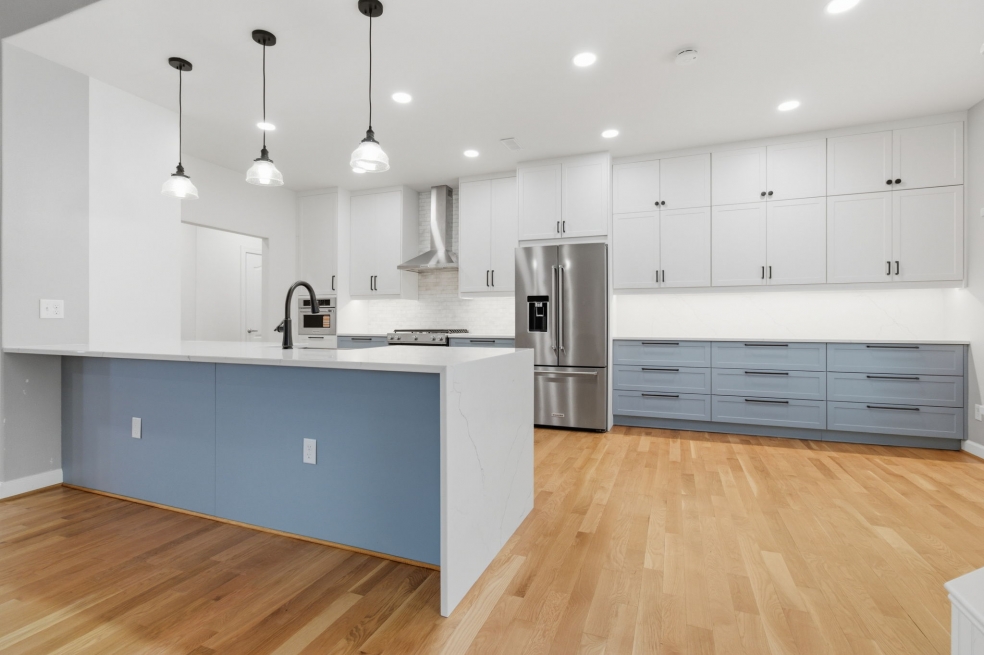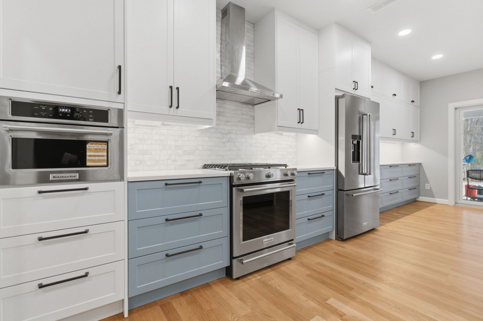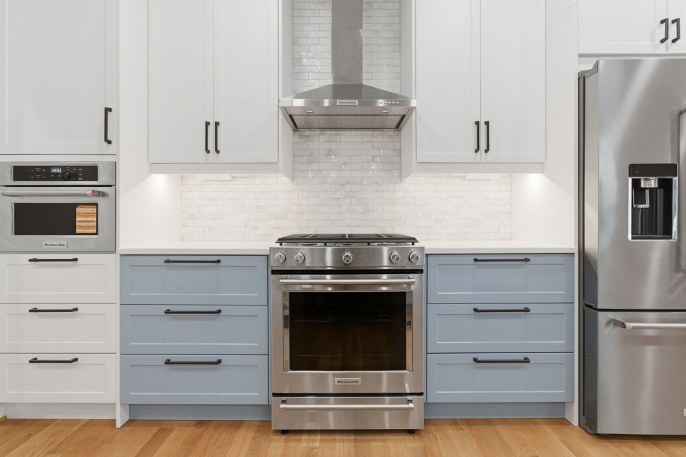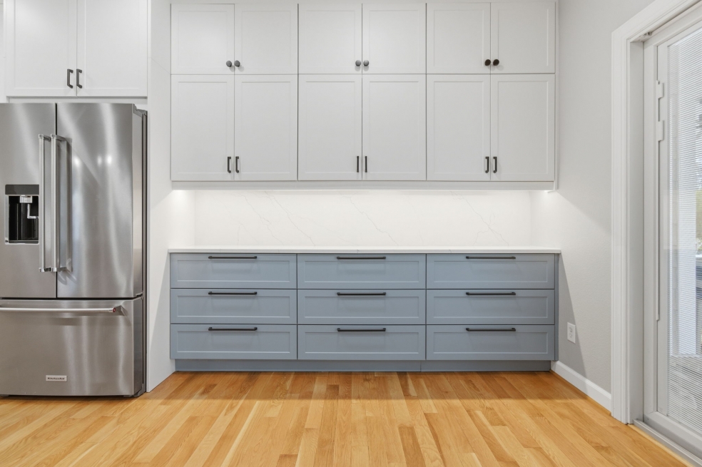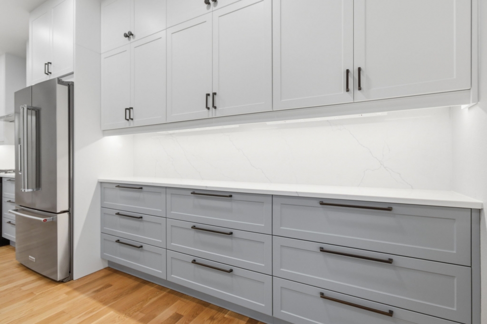 The custom doors and fronts by Embolden — in two-tone SuperMatte Shaker, Stratus and Denim — paired with double-stacked cabinets, make the most of the 9-foot ceilings and add unexpected storage. Finishing touches like soft-glow drawer lighting bring a quiet, luxurious warmth to the space. This kitchen isn’t just about looks, it’s about creating a home where everything works beautifully, every day!