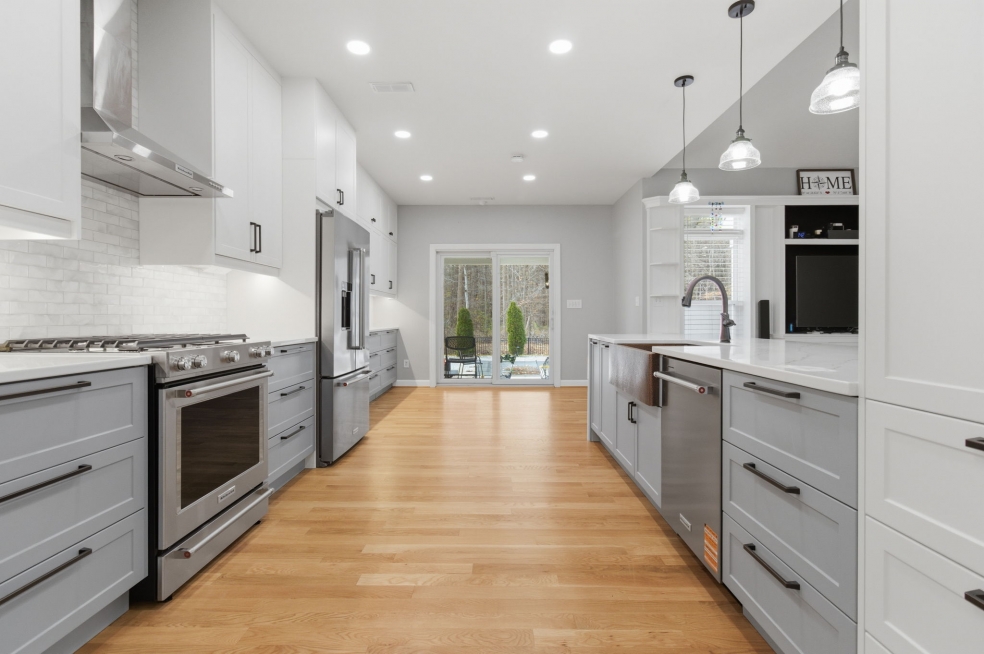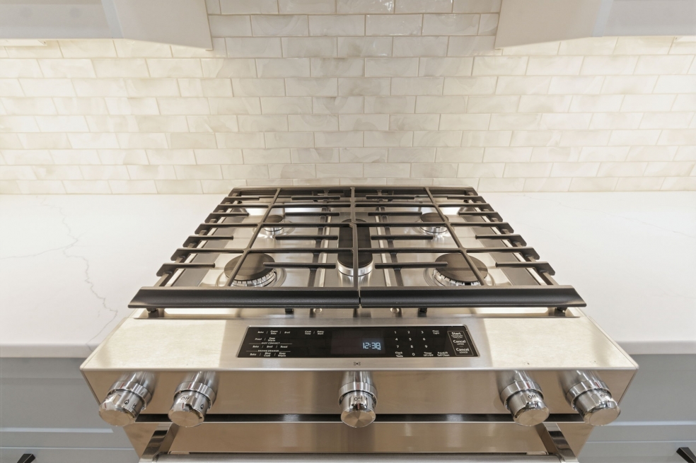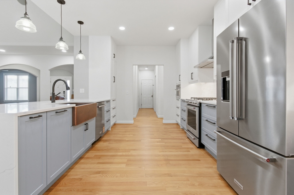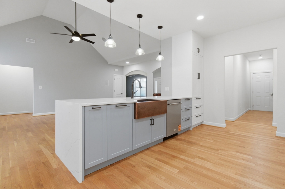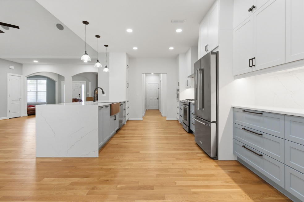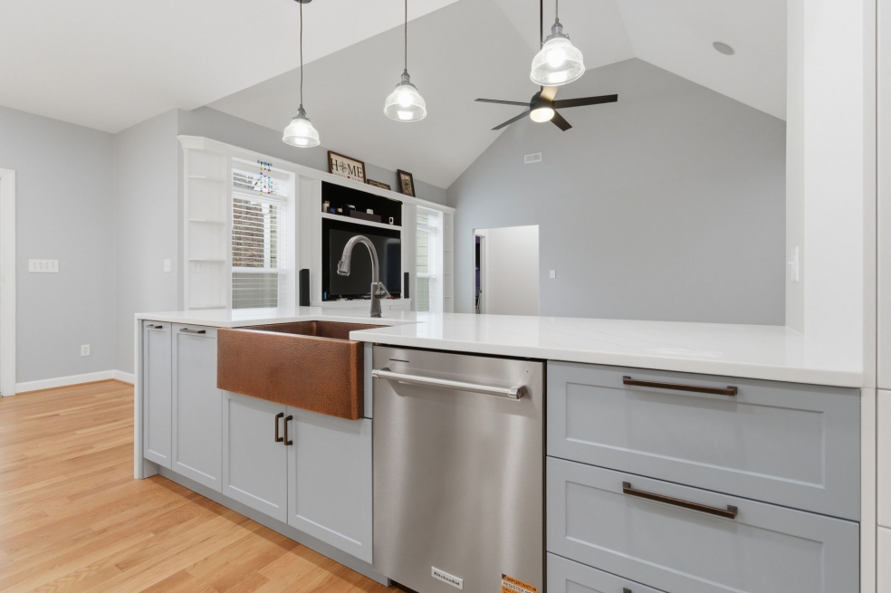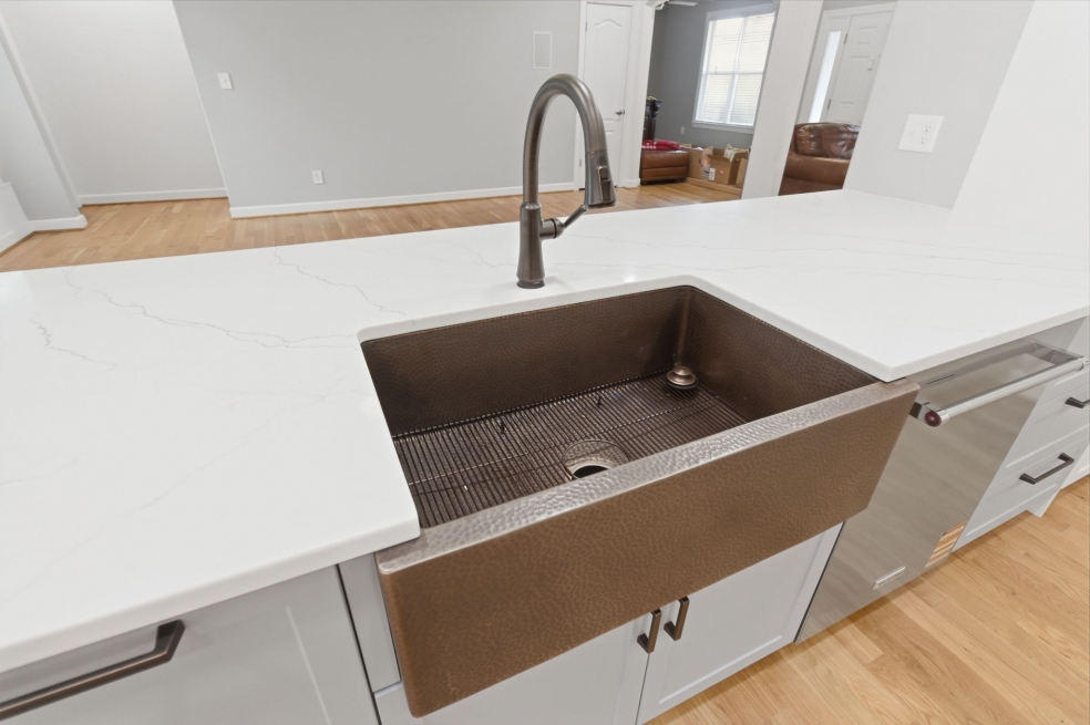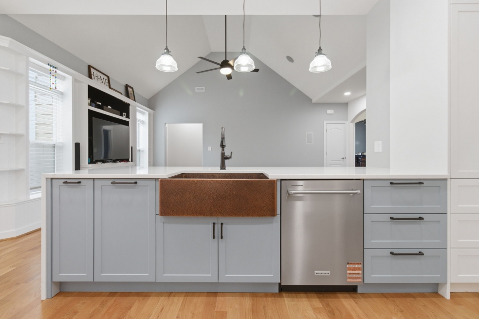 The KitchenAid appliances were fully integrated for a clean, cohesive look, while the waterfall quartz countertops and matching backsplash behind the range hood create a subtle but striking focal point. We hid all the outlets under the cabinets to keep the lines clean, and added a Luxury 33-Inch Copper Farmhouse Kitchen Sink by Fossil Blu with matching hardware that makes a statement without overpowering the room.