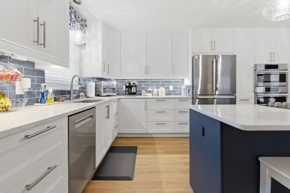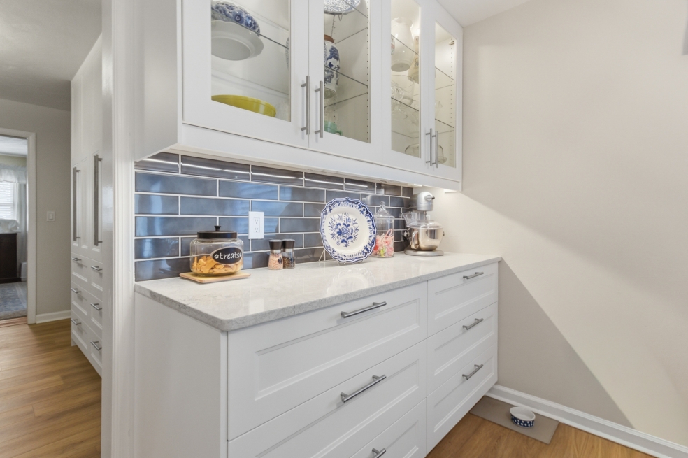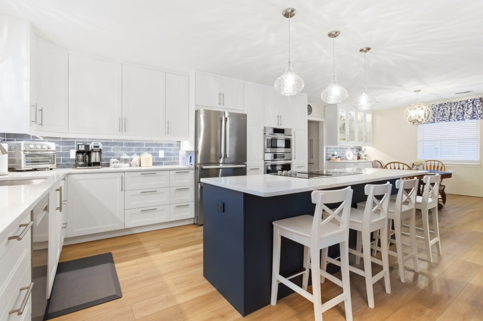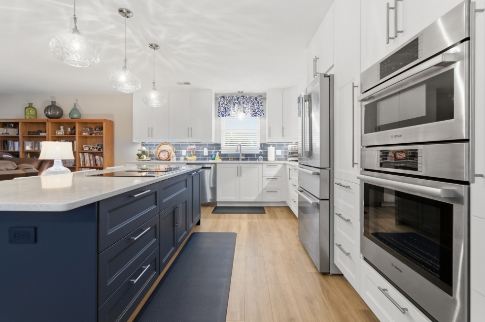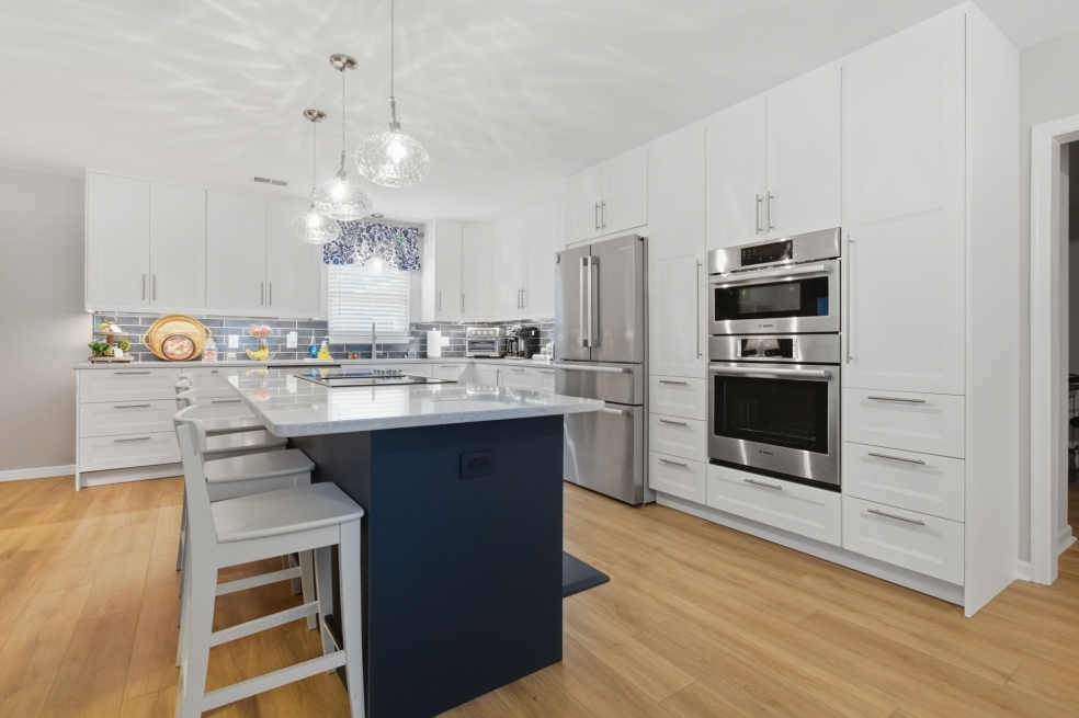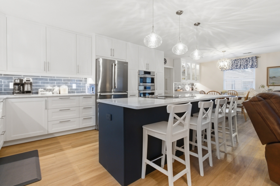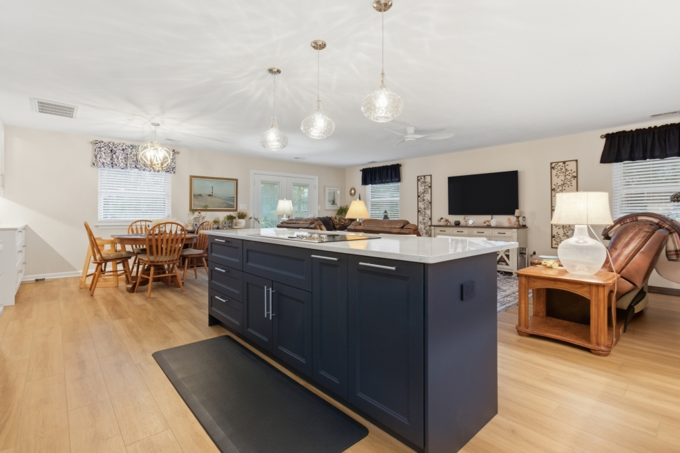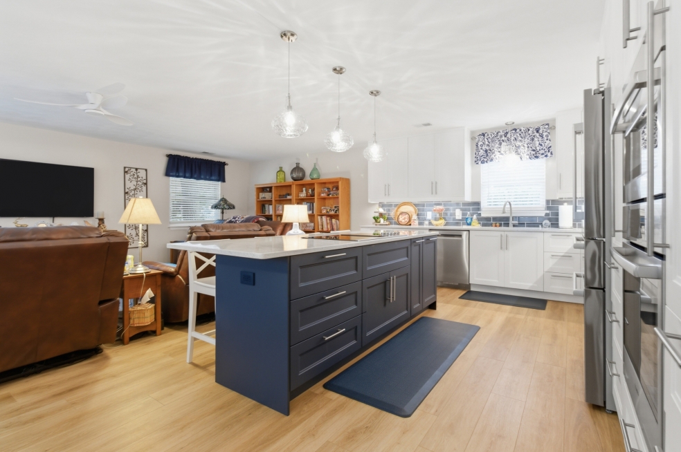 The space also includes a custom bar area with glass cabinets and built-in spotlights to show off your glassware. To finish the look, we added durable LVP flooring, new energy-efficient windows, and a matching patio door. Every part of this project—from the Quartz countertops to the subway tile backsplash that matches the navy blue island—was carefully integrated to make sure the transition from old to new was exactly what the homeowners envisioned.