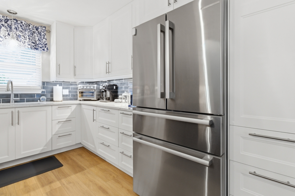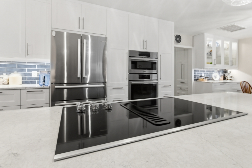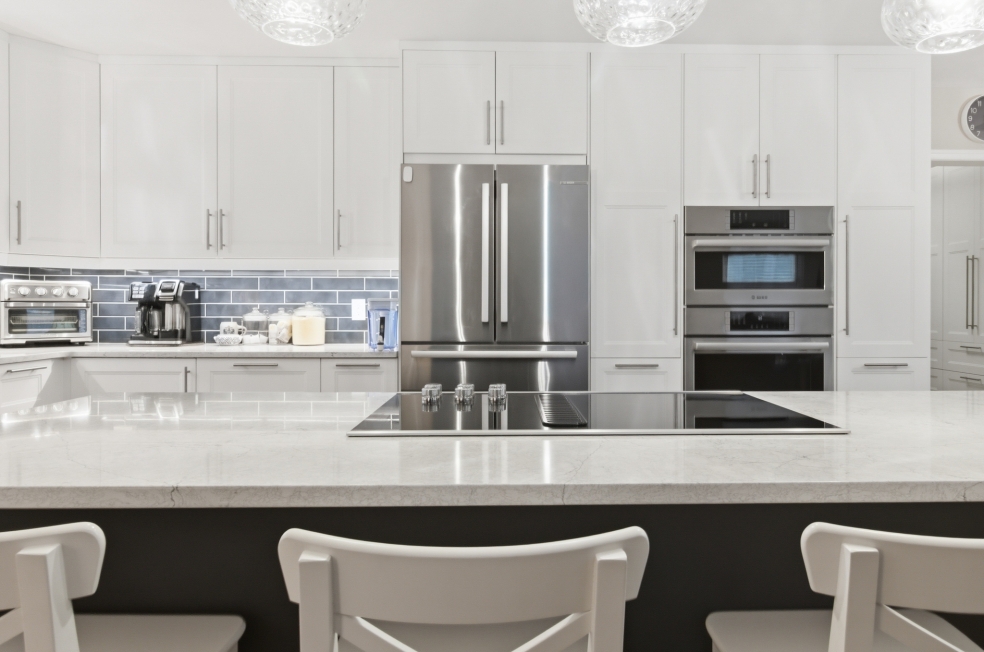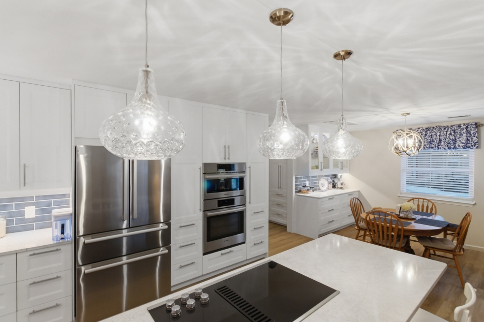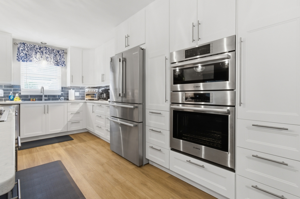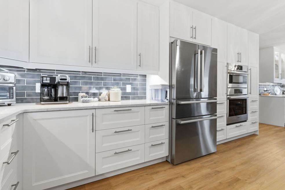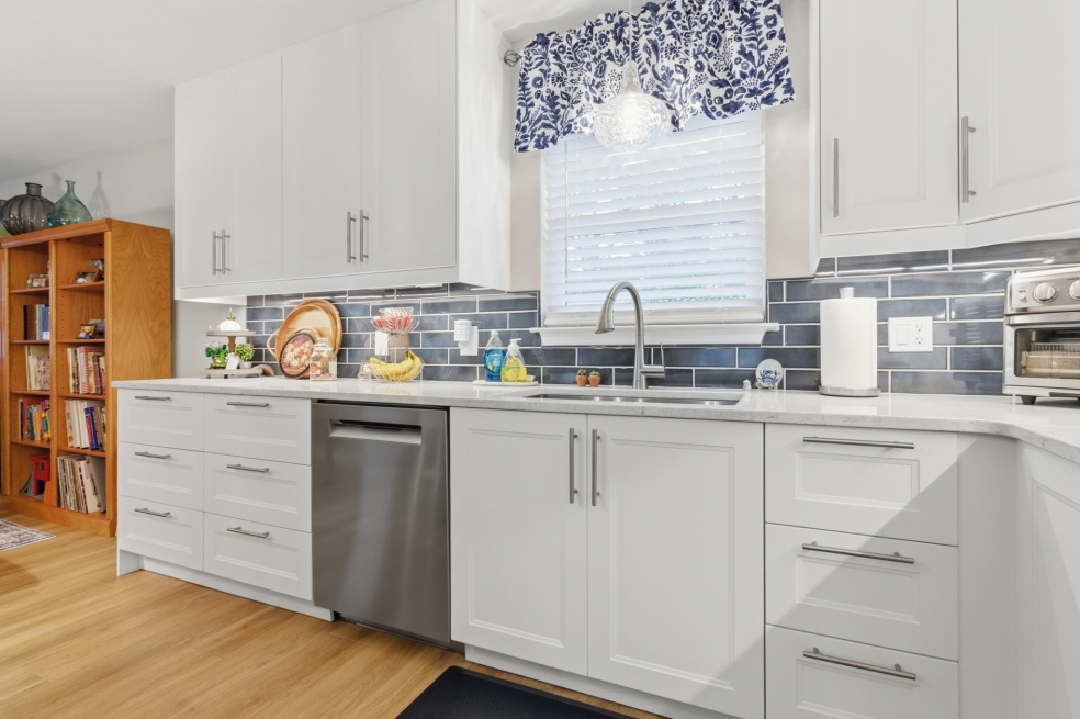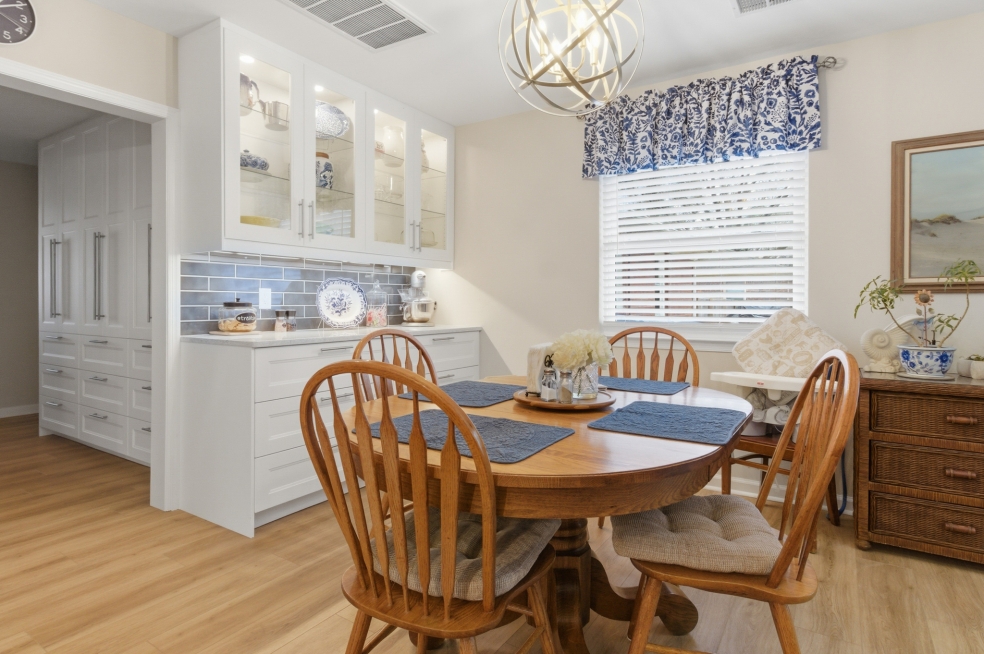 The space also includes a custom bar area with glass cabinets and built-in spotlights to show off your glassware. To finish the look, we added durable LVP flooring, new energy-efficient windows, and a matching patio door. Every part of this project—from the Quartz countertops to the subway tile backsplash that matches the navy blue island—was carefully integrated to make sure the transition from old to new was exactly what the homeowners envisioned.